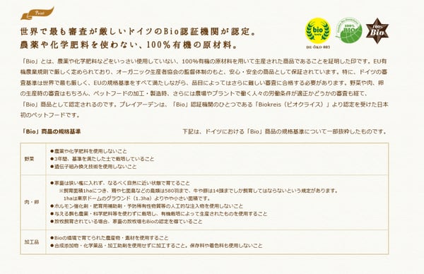有機ポーク 47%、有機ポークその他の部位 47%(有機心臓、有機肺、有機肝臓)、有機ビート繊維 2%、有機ニンジン 2%、有機キビ 1%、有機ヒマワリ油 0.5%、有機キクイモ 0.5%《肉と臓器の含有率94%以上》